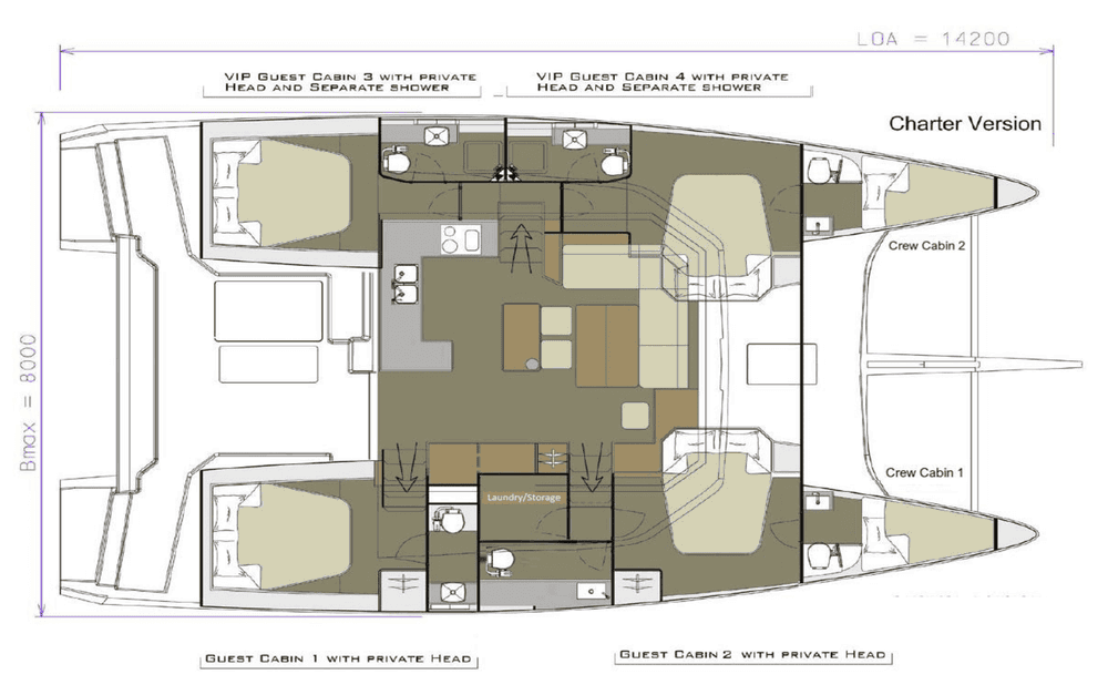 It is available in four and five cabin layouts, with island beds in the forward cabins, making them significantly larger than similar sized rivals.