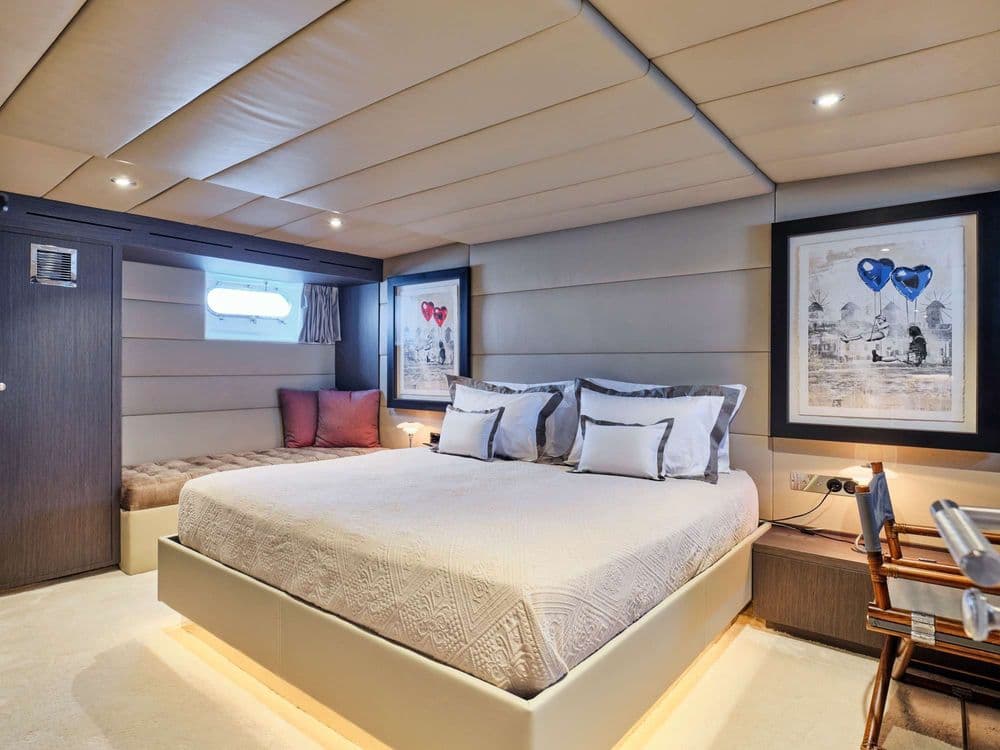 She has recently competed an ambitious total refit 2020-2022. Complete interior and exterior refurbishment, with a sleek and comfy beach house feel. Total remodelling of a brand new fly bridge with outdoor cinema, BBQ, awning, modular lounge/ sunning area/ al-fresco dining. Together with other splendid features like her large Jacuzzi and stabilisers, and an exceptional crew.